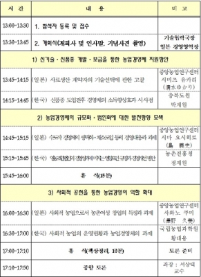 또한, 농업경영 법인의 경영지속성을 위한 과제, 농업생산자의 기술선택에 관한 시사점 등도 논의 될 예정이다.