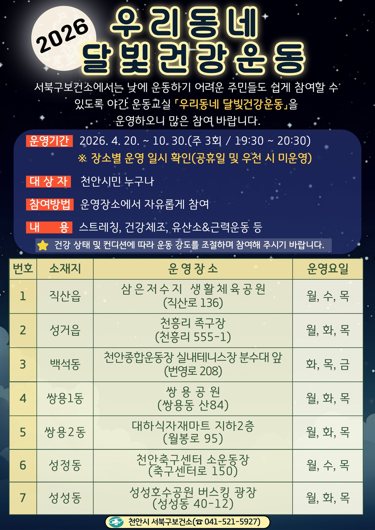 [충청뉴스큐] 천안시는 오는 20일부터 10월 30일까지 ‘우리동네 달빛건강운동’을 운영한다고 10일 밝혔다.