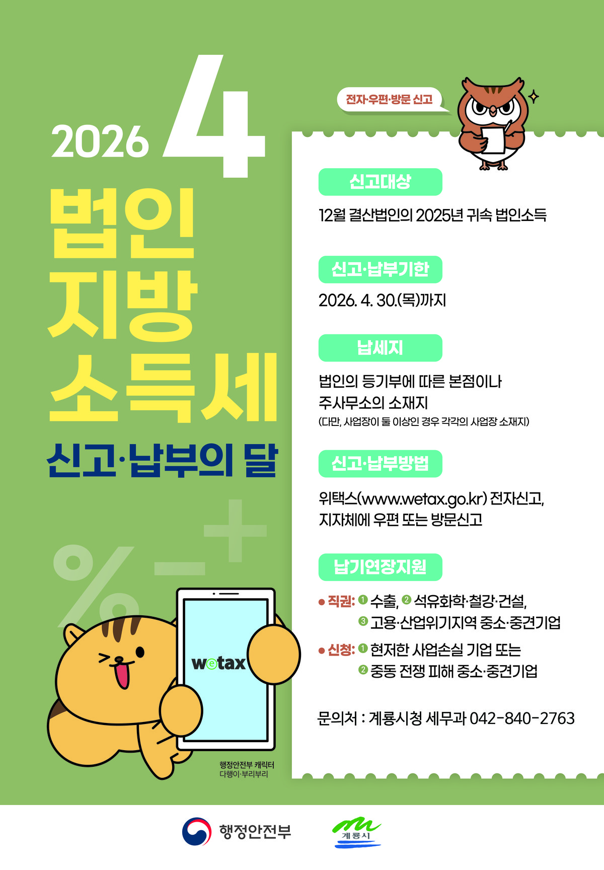 [충청뉴스큐] 충남 계룡시는 오는 4월 30일까지 ‘2025년 귀속 법인지방소득세 집중 신고 납부 기간’을 운영한다고 밝혔다.