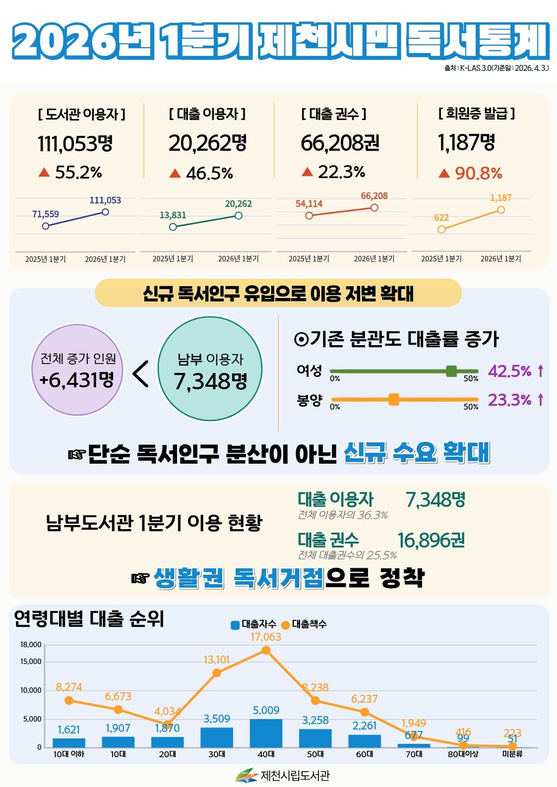 2026년 1분기 도서관 이용자는 11만1053명으로 전년 동기 7만1559명보다 55.2% 증가했으며 대출 이용자는 2만262명으로 46.5% 늘었다.
