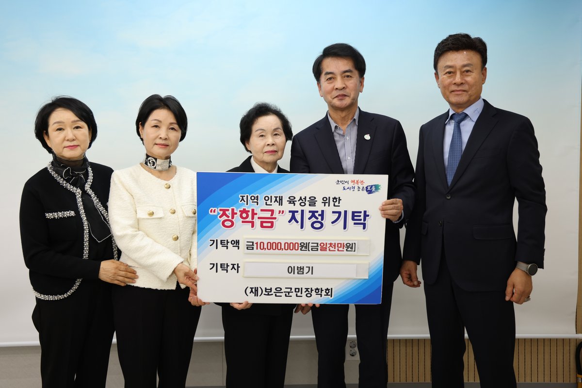 [충청뉴스큐] 충북 보은군은 10일 고 이범기님의 자녀인 장녀 이종옥 씨, 차녀 이종숙 씨, 삼녀 이미애 씨, 사남 이종덕 씨가 고인의 이름으로 보은군민장학회에 장학금 1000만원을 기탁했다고 밝혔다.