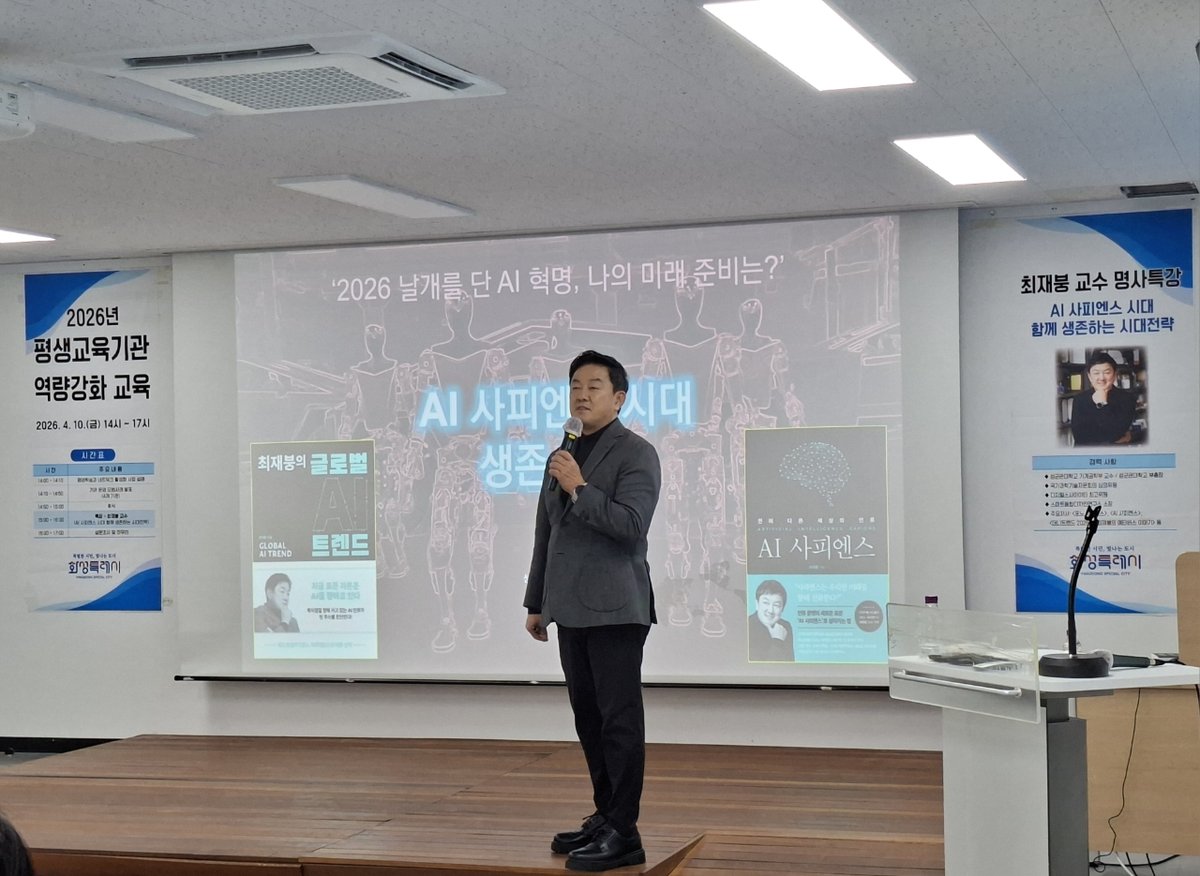 이번 교육은 평생학습과 네트워크 활성화 사업 안내 평생교육기관 운영 모범사례 발표 최재붕 교수의 ‘AI 사피엔스 시대, 함께 생존하는 전략’명사특강 등으로 구성됐다.