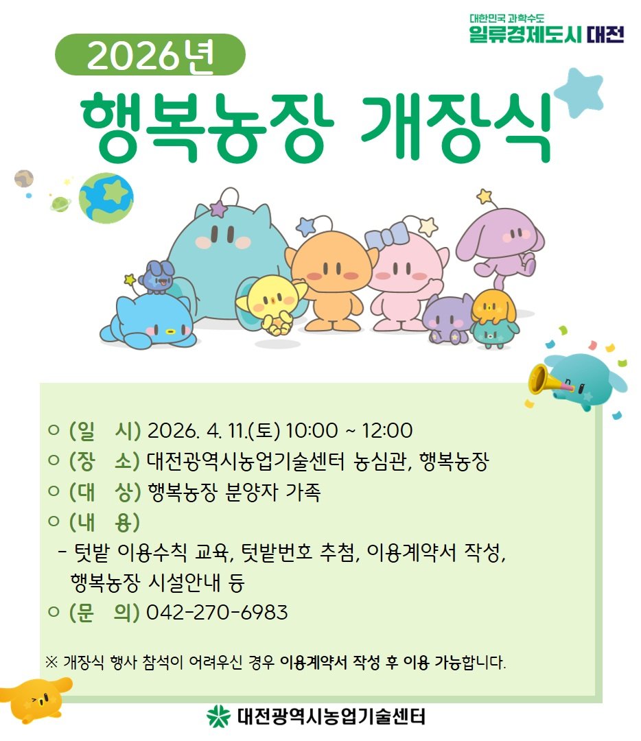 이장우 대전시장은 “도시농업의 날을 맞아 본격적인 경작이 시작되는 만큼, 행복농장에서 건강과 수확의 기쁨을 함께 누리시길 바란다”고 말했다.