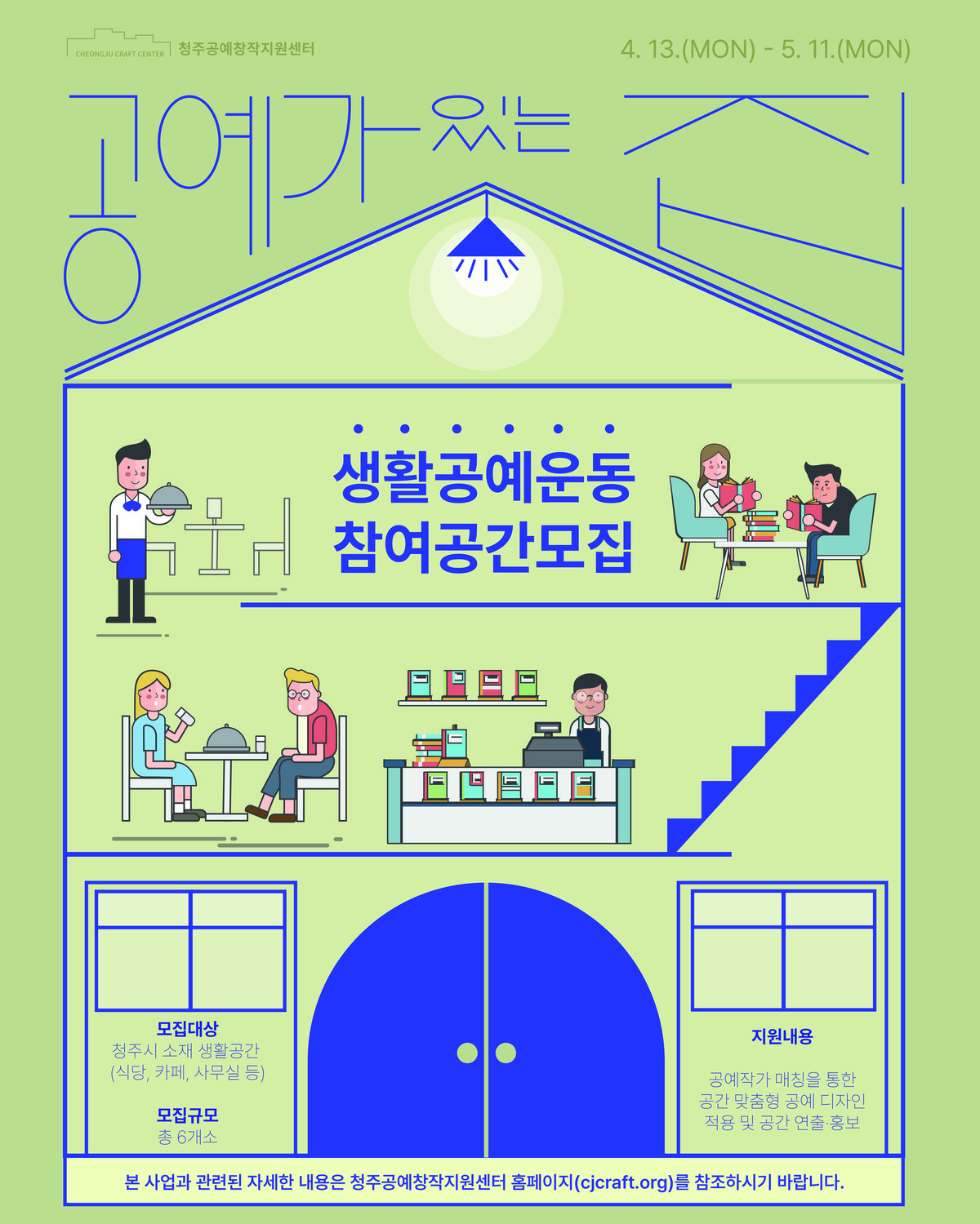 모집 대상은 청주시 소재 카페, 식당, 사무실 등 생활공간 6개소로 최종 선정된 공간에는 지역 공예가와의 1대 1 매칭을 통해 공간의 특성과 이용자 성격을 반영한 공예적 공간 디자인이 지원된다.