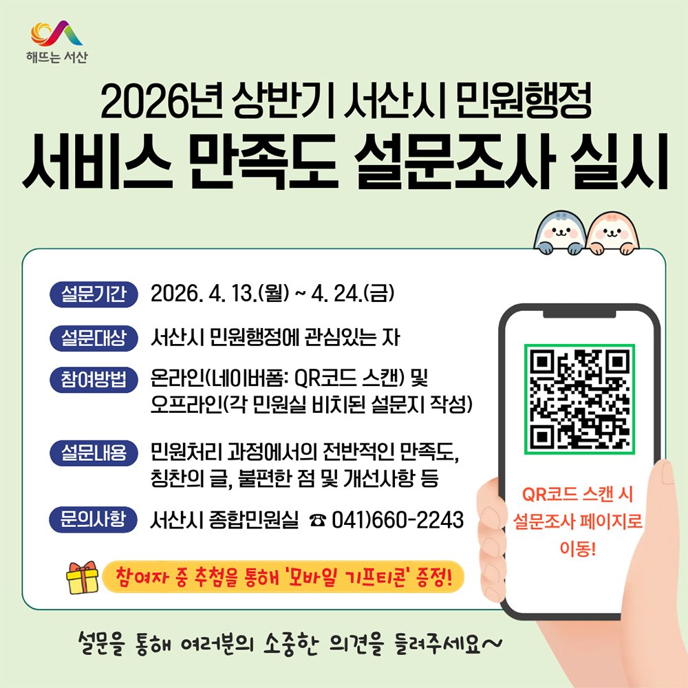 [충청뉴스큐] 시는 4월 13일부터 24일까지 ‘2026년 상반기 민원행정 서비스 만족도 설문조사’를 진행할 계획이라고 밝혔다.