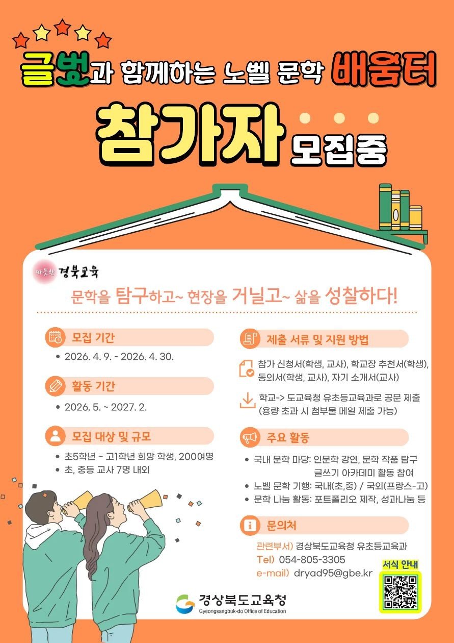 임종식 교육감은 “글벗과 함께하는 노벨 문학 배움터는 학생과 교사가 서로의 글벗이 되어 문학을 깊이 탐구하고 생각을 글로 표현하며 함께 성장하는 배움의 장”이라며 “이번 사업이 경북 독서·인문교육을 한 단계 도약시키는 계기가 될 수 있도록 적극 지원하겠다”고 말했다.