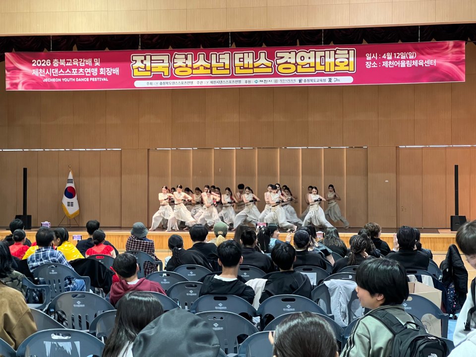 [충청뉴스큐] 제천시에서 개최된 2026 충북교육감배 겸 제천시댄스스포츠연맹회장배 전국 청소년 댄스경연대회 가 전국 청소년들의 뜨거운 열기 속에 성황리에 마무리됐다.