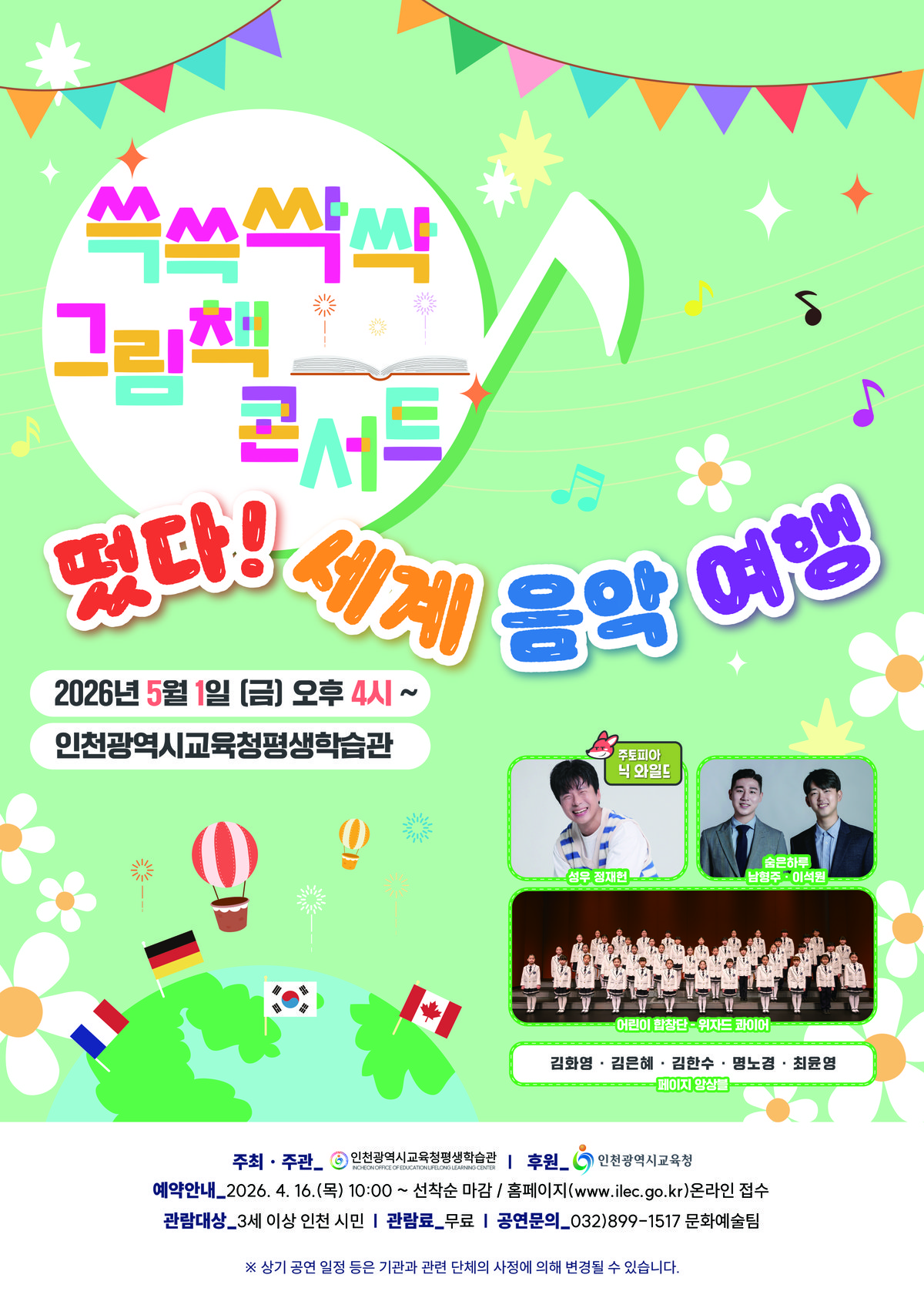[충청뉴스큐] 인천광역시교육청평생학습관은 5월 1일 인천 시민을 대상으로 ‘쓱쓱싹싹 그림책 콘서트, 떳다 세계 음악 여행’ 공연을 개최한다.