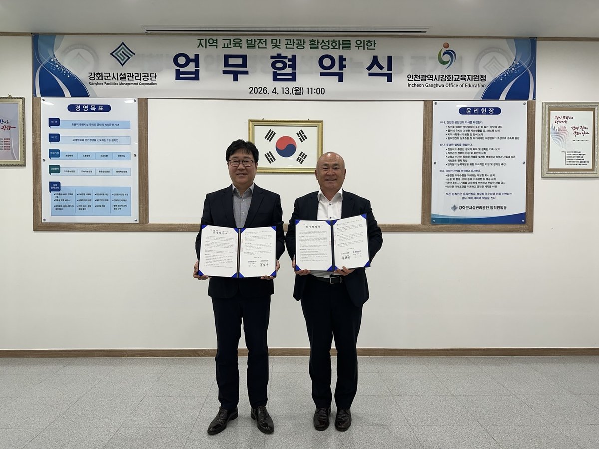 [충청뉴스큐] 인천강화교육지원청은 13일 강화군시설관리공단과 ‘지역 교육 발전 및 관광 활성화를 위한 업무협약’을 체결했다.