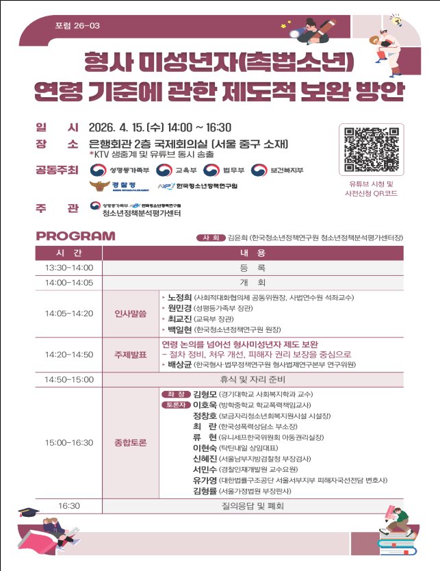 [충청뉴스큐] 성평등가족부, 교육부, 법무부, 보건복지부, 경찰청, 한국청소년정책연구원은 4월 15일 오후 2시 은행회관에서 ‘형사미성년자 연령 기준에 관한 제도적 보완 방안’을 주제로 제2차 포럼을 공동 개최한다.