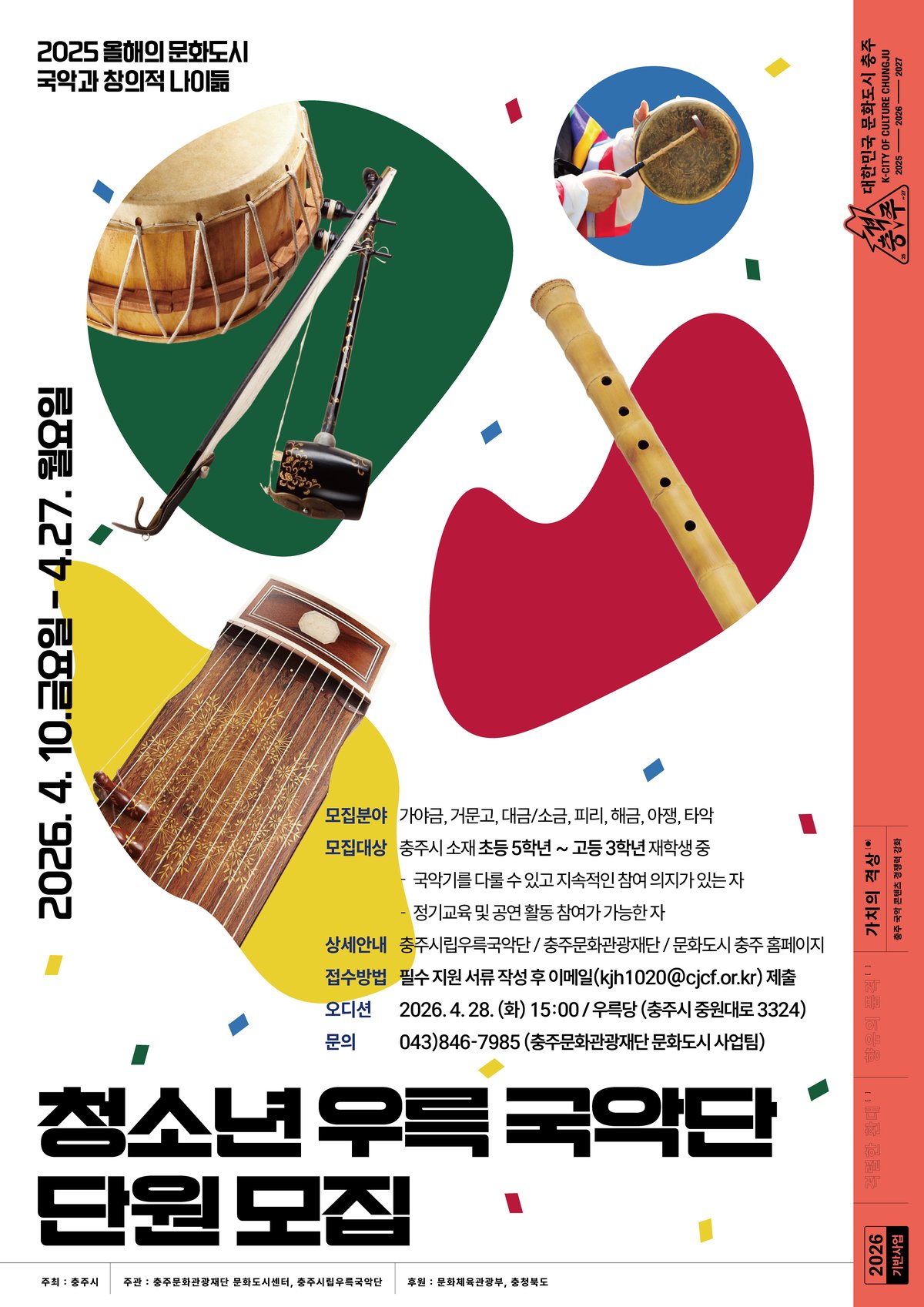 충주시와 충주문화관광재단 문화도시센터는 국악 콘텐츠 허브 도시로서의 위상을 높이고 지역 청소년들에게 전문적인 국악 교육 기회를 제공하기 위해 “청소년 우륵국악단”신규단원을 오는 4월 27일까지 모집한다.
