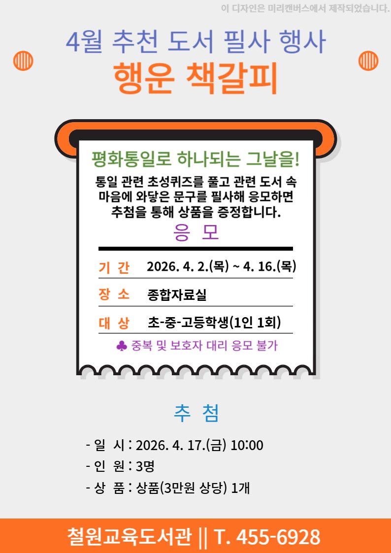 [충청뉴스큐] 철원교육도서관은 4월부터 11월까지 종합자료실에서 지역 초·중·고 학생을 대상으로 추천 도서 필사 행사 ‘행운 책갈피’를 8회 운영한다.