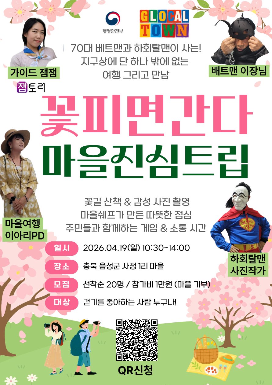 [충청뉴스큐] 충북 음성군 청년마을 글로컬타운이 주민과 청년이 함께 만든 지역관광 프로젝트 ‘꽃피면 간다, 마을 진심 트립’을 선보인다.