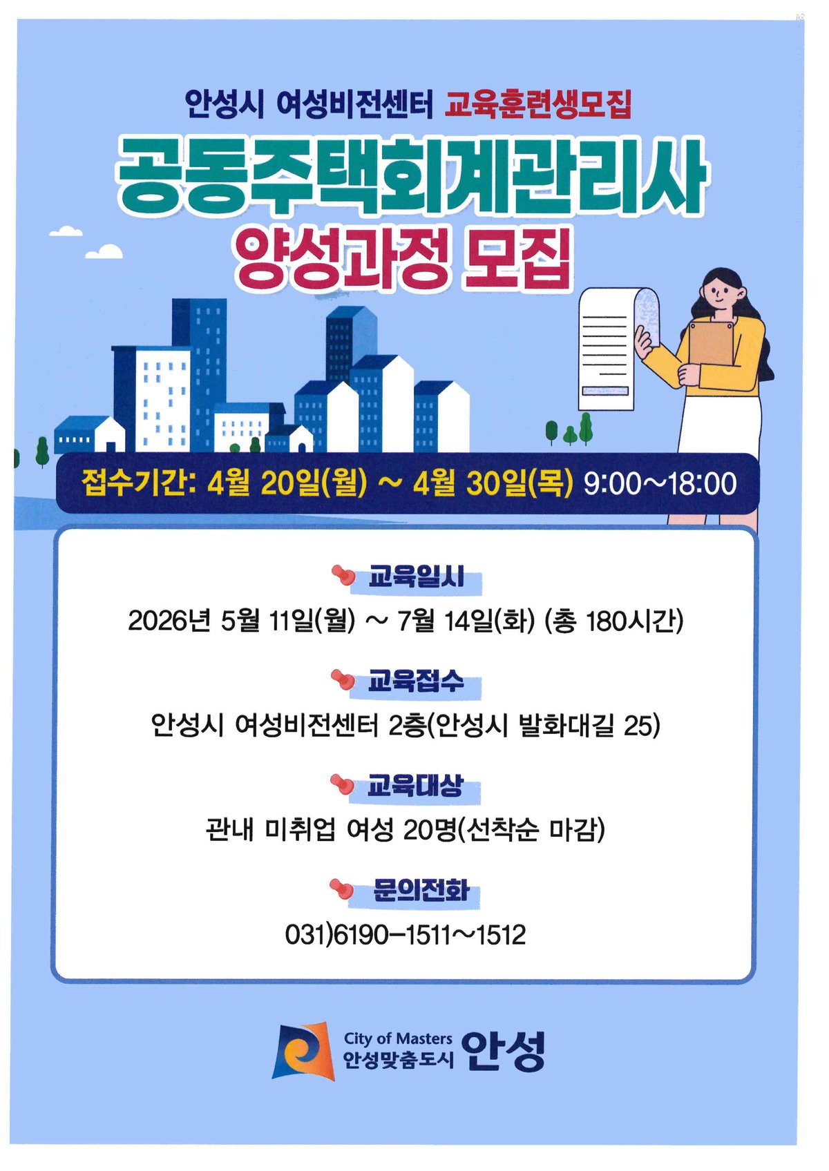 [충청뉴스큐] 안성시 여성비전센터는 경력보유여성의 성공적인 재취업을 지원하기 위해 오는 4월 30일까지 ‘공동주택 회계 관리사 양성과정’에 참여할 직업 훈련생 20명을 모집한다고 밝혔다.