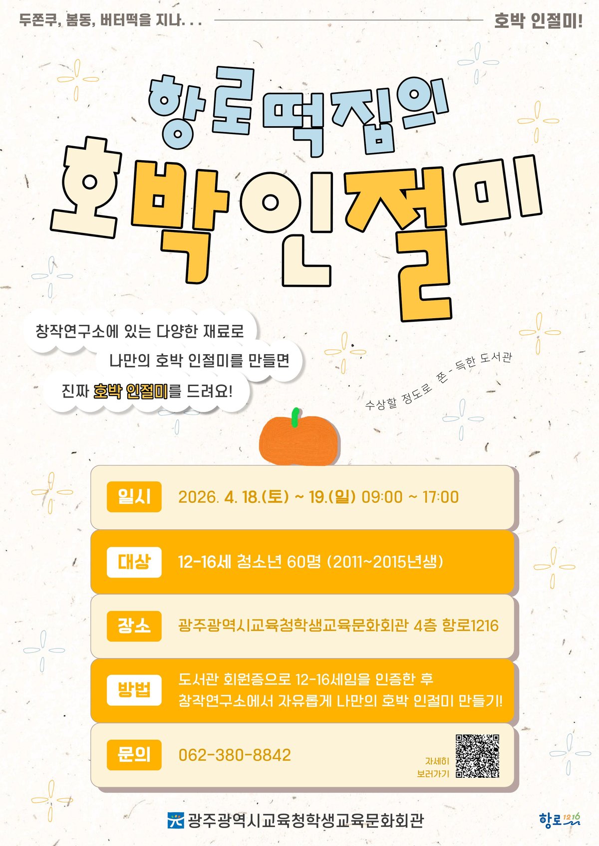 [충청뉴스큐] 광주시교육청학생교육문화회관은 오는 18~19일 회관 내 청소년 전용 공간 ‘항로1216'에서’호박 인절미 창작 챌린지 ‘를 운영한다. 이번 프로그램은 전국적으로 뜨고 있는 광주 대표 먹거리 중 하나인’호박 인절미‘를 활용해 청소년들이 창작활동을 할 수 있도록 지원하기 위해 마련됐다. 학생들은 항로1216에서 △점토 △비즈 등 110여 종의 다양한 재료를 활용해 자유롭게 창작 활동을 할 수 있다. 학생교육문화회관은 현장에 또래 도우미’항로1216 크루‘의 예시 작품과 창작에 영감을 주는 관련 도서를 전시해 참여 학생들의 구체적인 작품 구상을 도울 예정이다.
