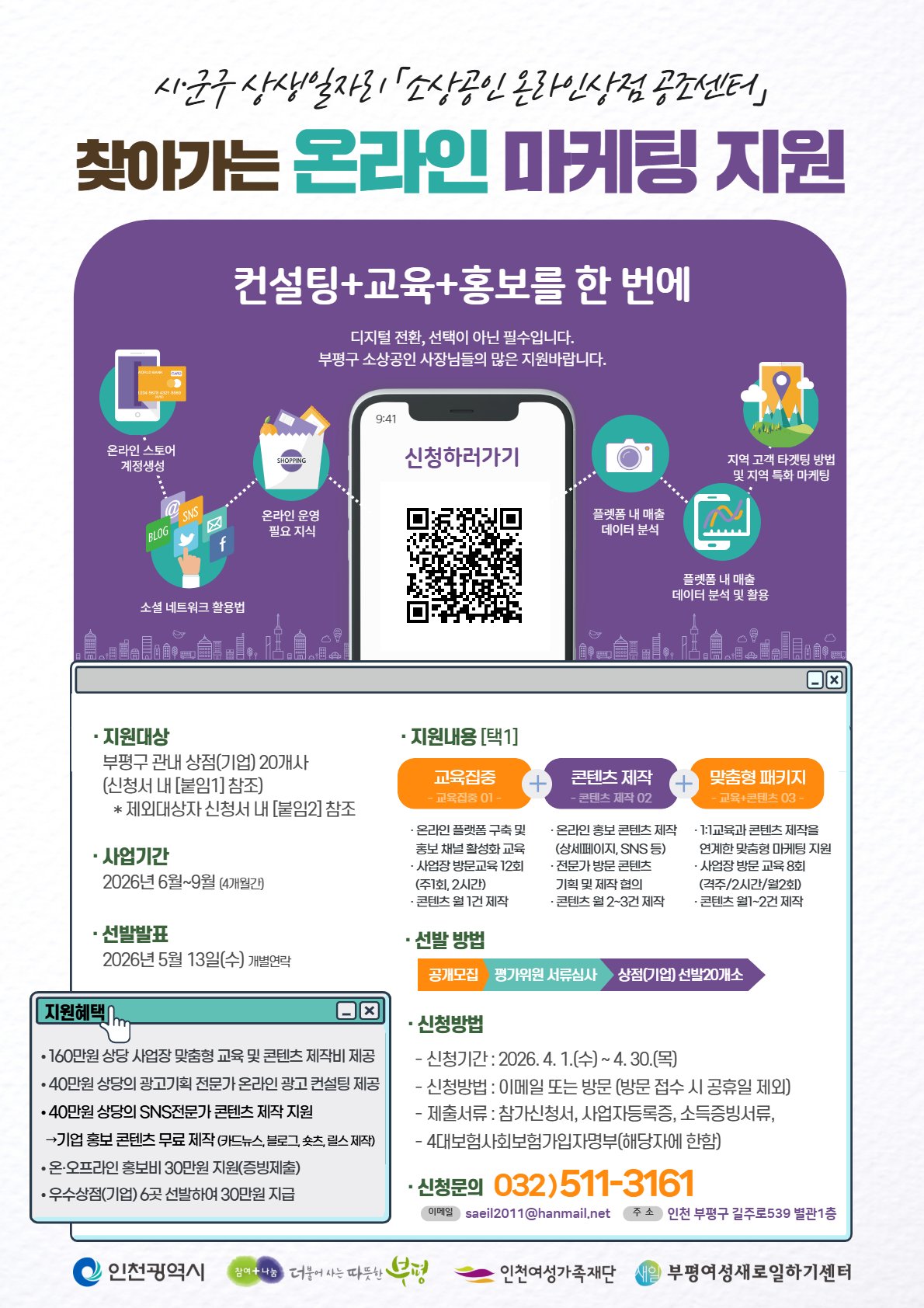 부평여성새로일하기센터 관계자는 “지난해 사업을 통해 디지털 전환의 필요성과 효과를 확인한 만큼, 올해는 보다 많은 기업이 실질적인 성과를 체감할 수 있도록 지원을 확대했다”며 “온라인 판로 개척에 어려움을 겪는 기업들의 많은 참여를 바란다”고 밝혔다.