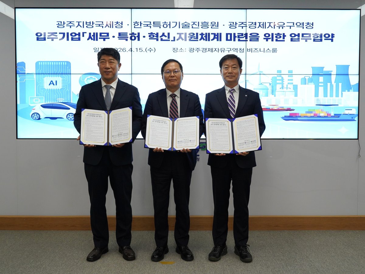이날 협약식에는 선석기 광주경자청장, 김학선 광주지방국세청장, 김명섭 한국특허기술진흥원장이 참석해 지역 기업의 혁신 성장을 위한 협력체계 구축에 뜻을 모았다.