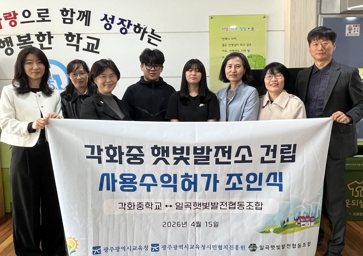 [충청뉴스큐] 광주시교육청시민협치진흥원은 15일 각화중학교에서 일곡햇빛발전협동조합과 탄소중립 실천 및 생태전환교육 활성화를 위한 ‘학교 햇빛발전소 구축 업무협약’을 체결했다.