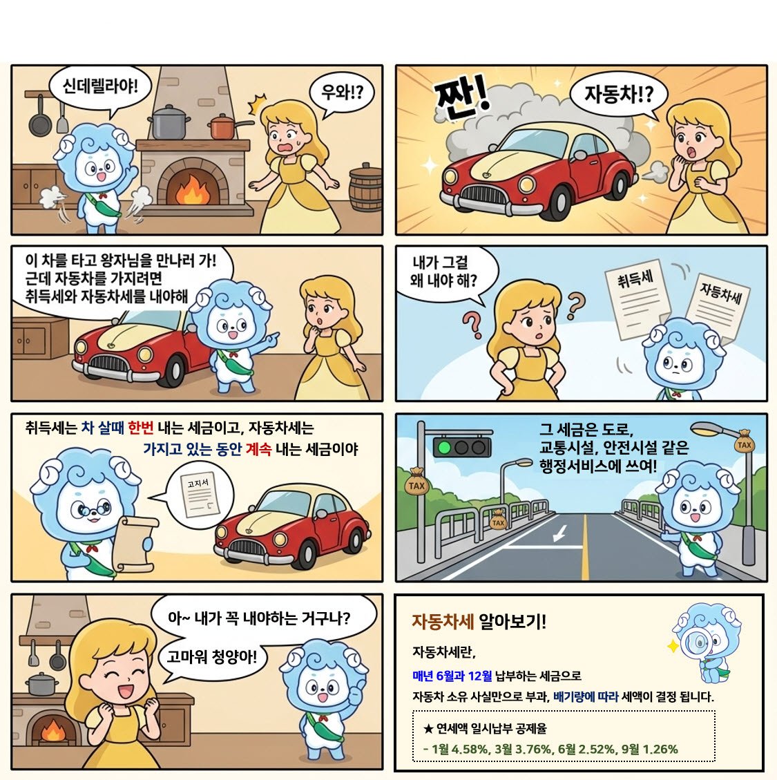 재산세와 자동차세의 의미, 체납 시 불이익 등 다소 무거운 세금 정보를 동화 속 상황과 연결해 자연스럽게 전달하는 것이 특징이다.