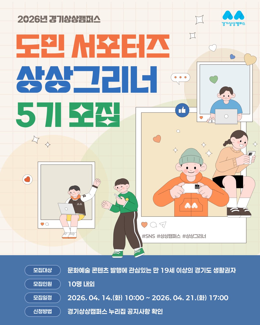 선정된 서포터즈는 5월부터 11월까지 약 7개월간 활동하며 경기상상캠퍼스의 △축제 △전시 △교육 프로그램 등을 직접 체험하고 이를 바탕으로 SNS 콘텐츠를 제작·발행한다.