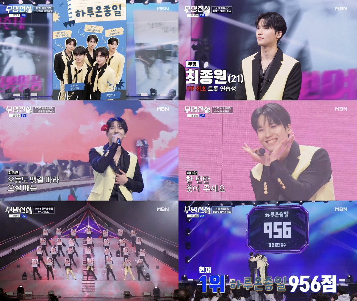 최종원은 지난 15일 방송된 MBN ‘무명전설-트롯 사내들의 서열전쟁’에서 하루, 이대환, 황윤성, 박민수와 ‘하루온종일’ 이라는 팀을 꾸려 무대에 올랐다.