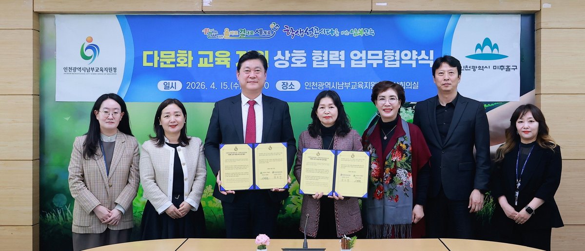 [충청뉴스큐] 인천남부교육지원청은 15일 미추홀구 소재 용비도서관과 다문화 교육 지원을 위한 상호협력 업무협약을 체결했다 이번 협약은 학생과 학부모, 지역사회가 함께하는 통합적 교육 기반을 마련하고 현장 중심의 지원 체계를 구축하기 위해 추진됐다.