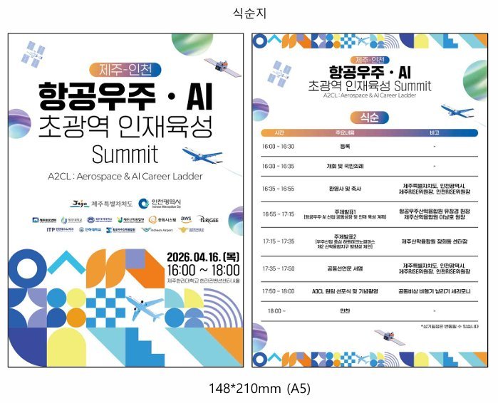 참고 행사 이미지 및 공동선언문 행사 Key 이미지 공동선언문 인천 제주 항공우주·AI 초광역 인재육성 공동선언문 제주특별자치도와 인천광역시는 대한민국의 미래를 선도하는 항공우주·AI 분야의 산업·경제권으로 제주와 인천이 함께 발돋움하기 위한 초광역 인재육성 체계 구축을 공동으로 추진할 것을 선언한다.