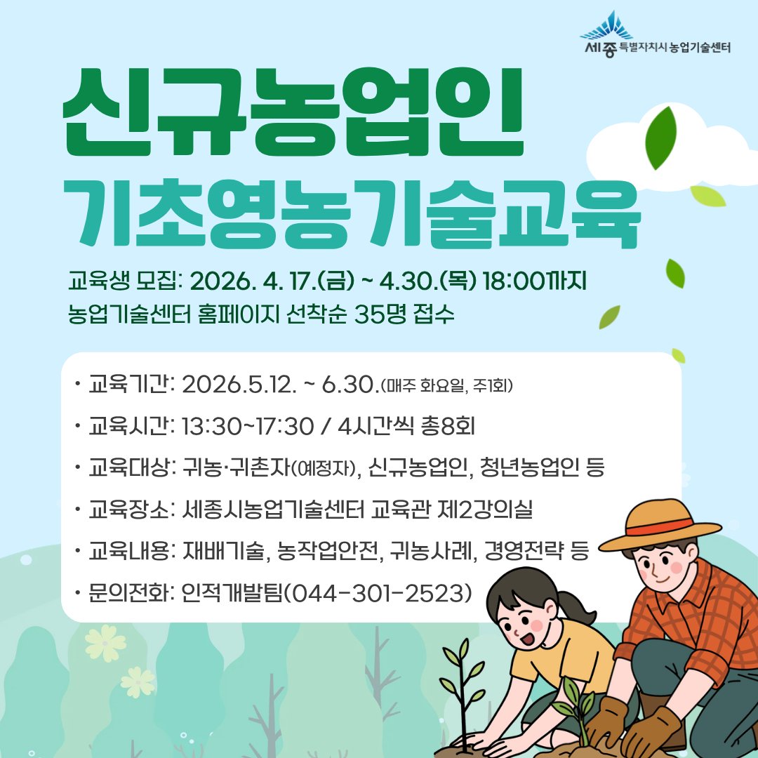 [충청뉴스큐] 세종시 농업기술센터가 귀농·귀촌자 및 신규농업인을 대상으로 신규농업인 기초영농기술교육 1기 교육생을 선착순 모집한다고 17일 밝혔다.