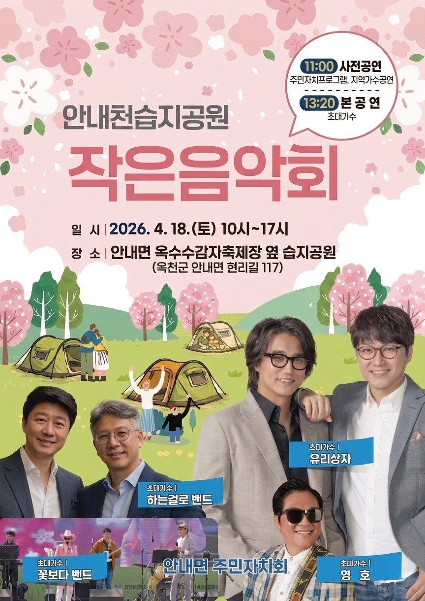 [충청뉴스큐] 옥천군 안내면 주민자치회는 오는 4월 18일 토요일 안내천 인공습지 일원에서 주민들과 함께하는 문화 행사 안내천 습지공원 작은 음악회 를 개최한다.