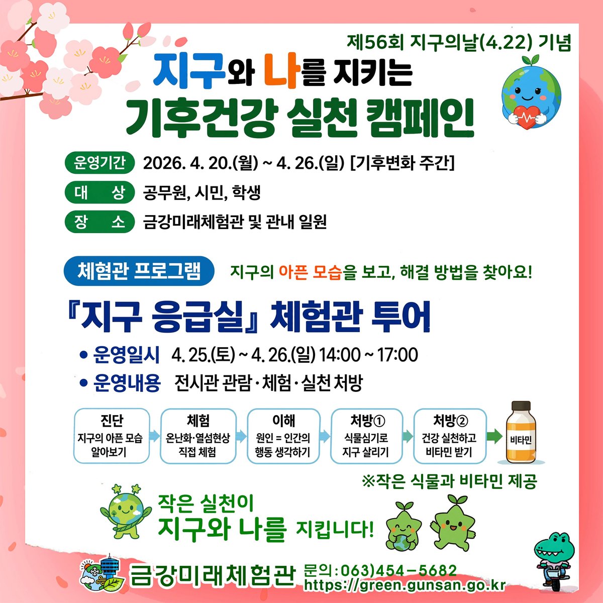[충청뉴스큐] 군산시는 제56회 지구의 날과 기후변화주간을 맞아 시민들의 기후위기 대응 참여를 유도하기 위해 4월 20일부터 26일까지 ‘지구와 나를 지키는 기후건강 실천 캠페인’을 운영한다고 밝혔다.