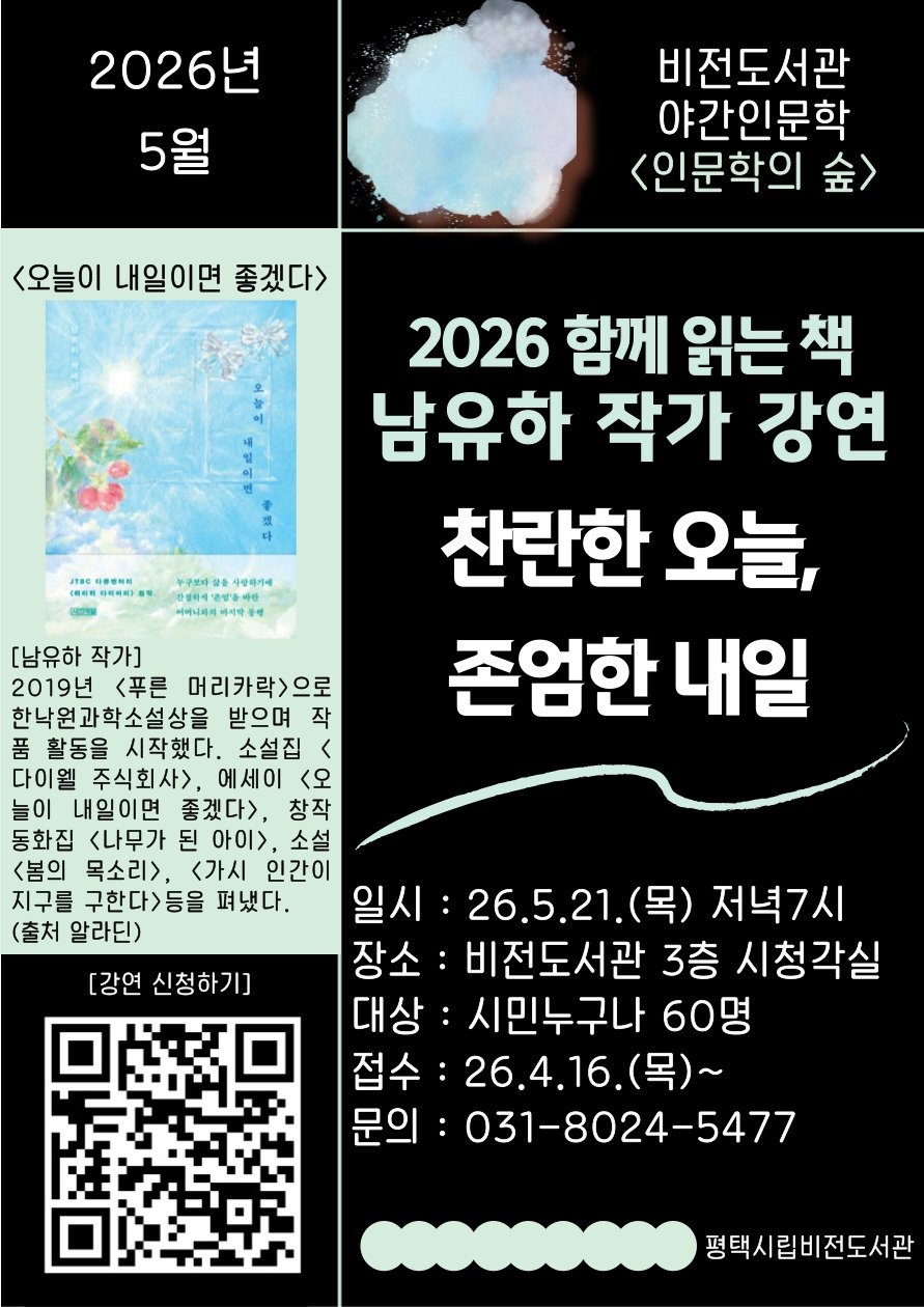 [충청뉴스큐] 평택시립 비전도서관은 오는 5월 21일 저녁 7시 남유하 작가를 초청해 ‘찬란한 오늘, 존엄한 내일’을 주제로 야간 인문학 강연을 진행한다.