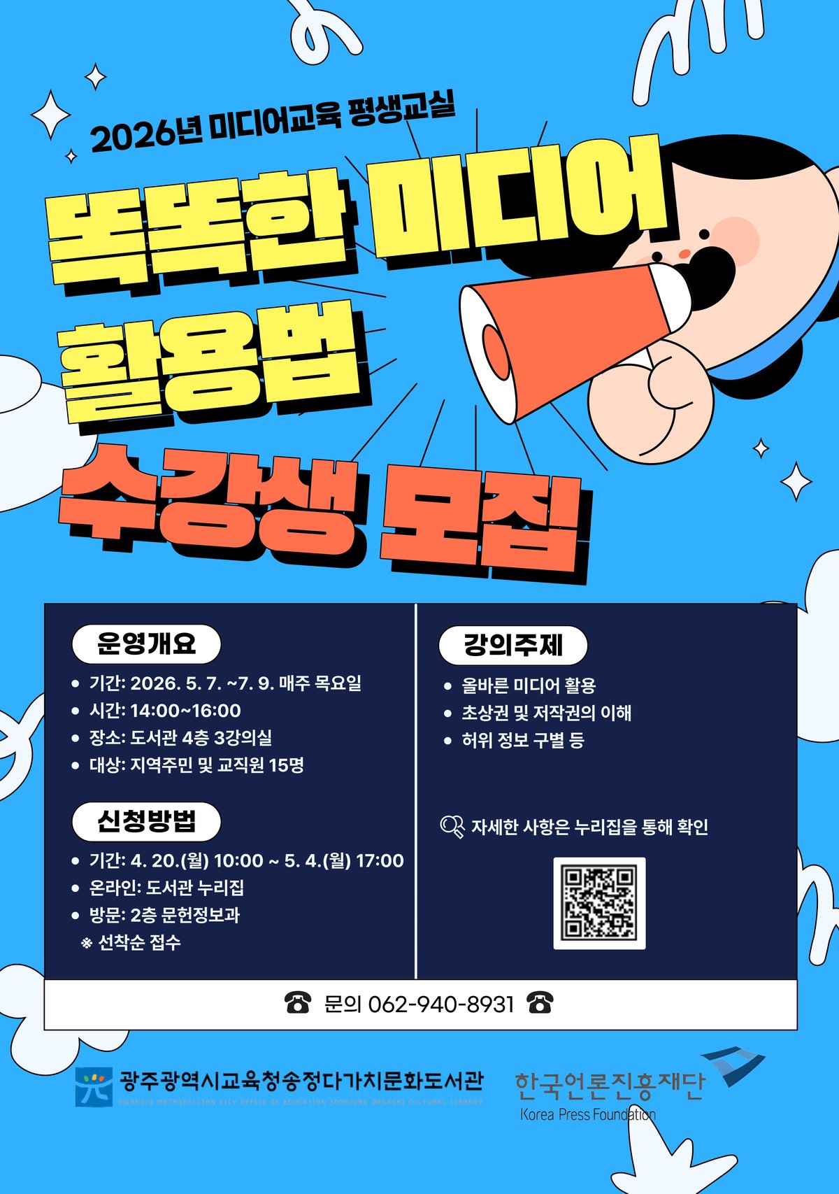 [충청뉴스큐] 광주시교육청송정다가치문화도서관은 오는 5월 7일부터 7월 9일까지 ‘2026년 미디어교육 평생교실’을 운영한다.