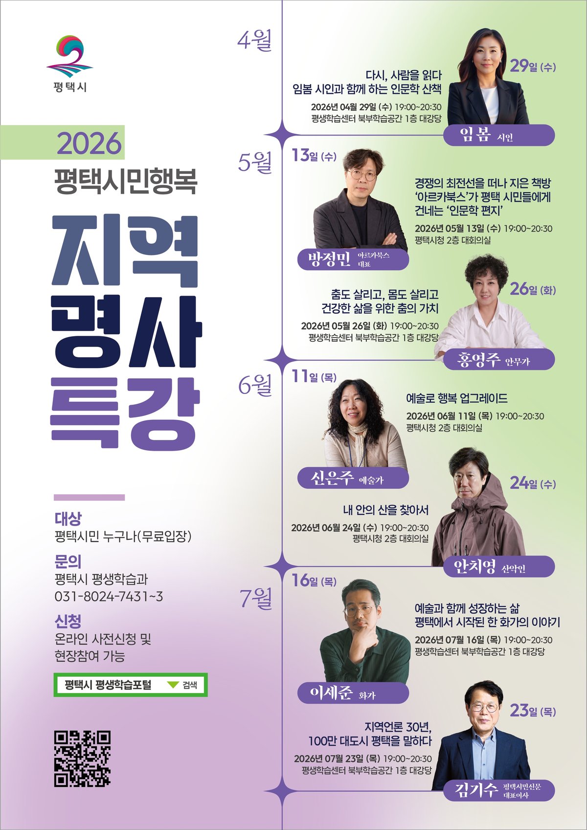 [충청뉴스큐] 평택시는 시민들의 지식과 교양 증진은 물론, 평택에 대한 이해를 높이고 지역의 가치를 재조명하기 위해 ‘2026년 평택시민행복 지역명사 특강’을 오는 4월부터 7월까지 운영한다고 밝혔다.