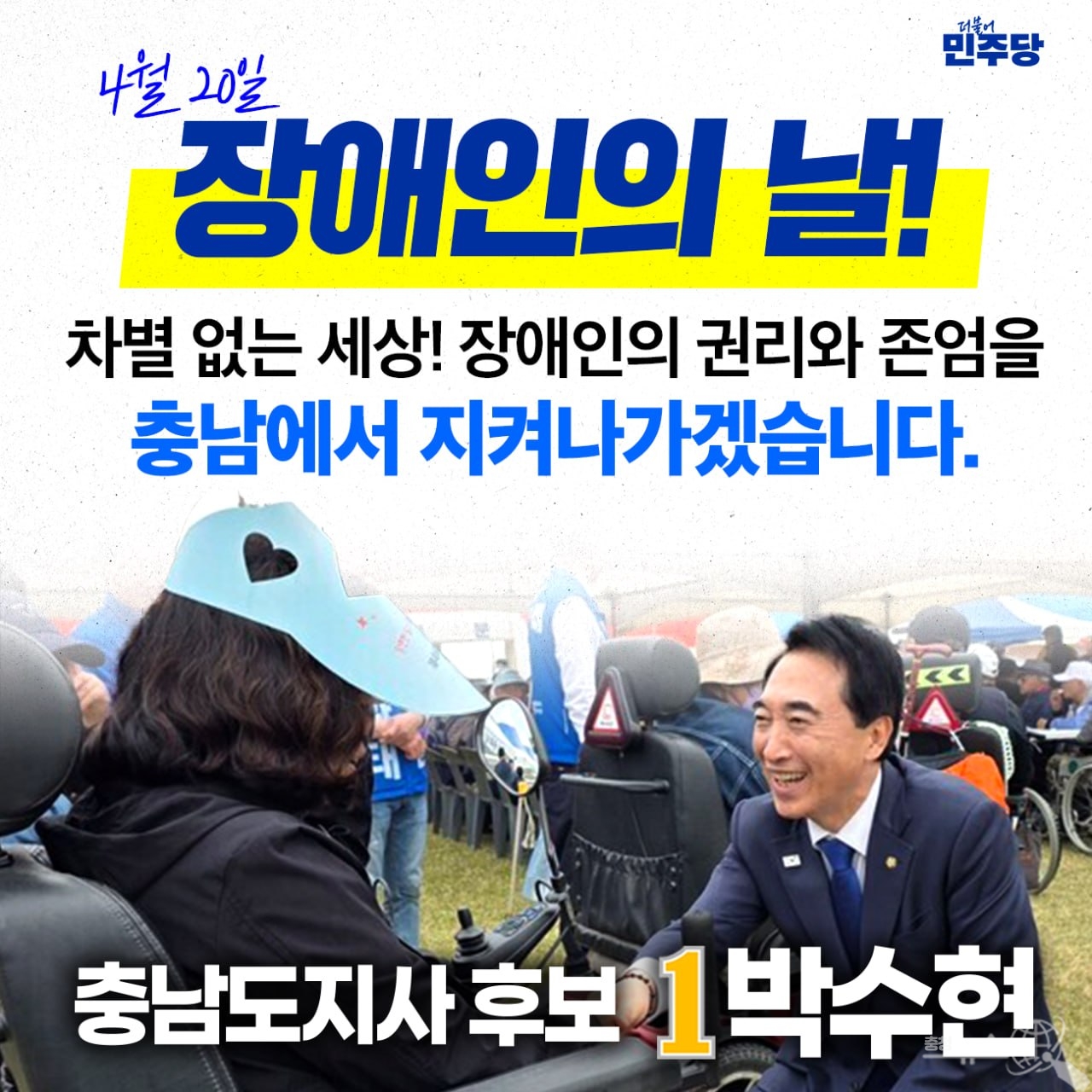 박수현 더불어민주당 충청남도지사 후보(더불어민주당 충남 공주·부여·청양 국회의원)는 20일 제 46회 장애인의 날을 맞아 “충남의 13만 장애인이 우리 사회의 당당한 일원으로 통하는 사회를 만들겠다”며 장애인 이동·자립·건강·일자리·권익이 보장되는 충남의 비전을 밝혔다.