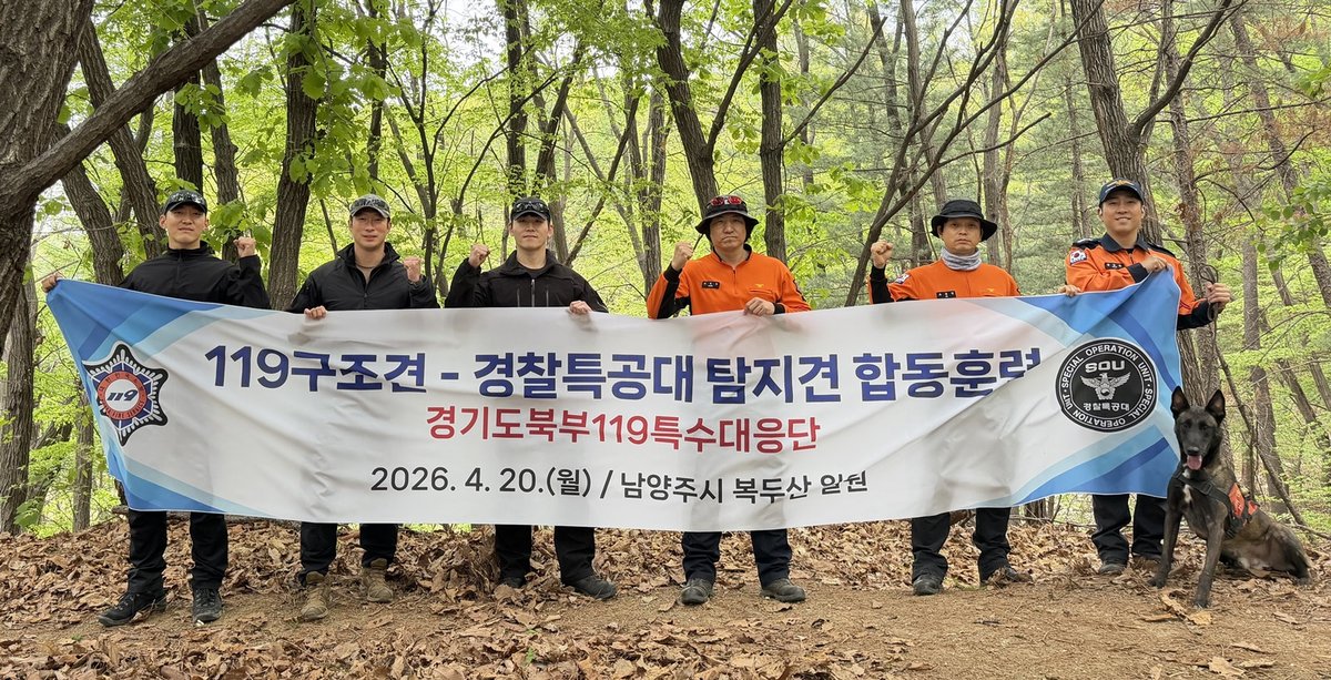 [충청뉴스큐] 경기도북부119특수대응단은 20일 남양주시 복두산 구조견센터 훈련장에서 119구조견과 경찰특공대 탐지견이 참여하는 합동훈련을 실시했다.