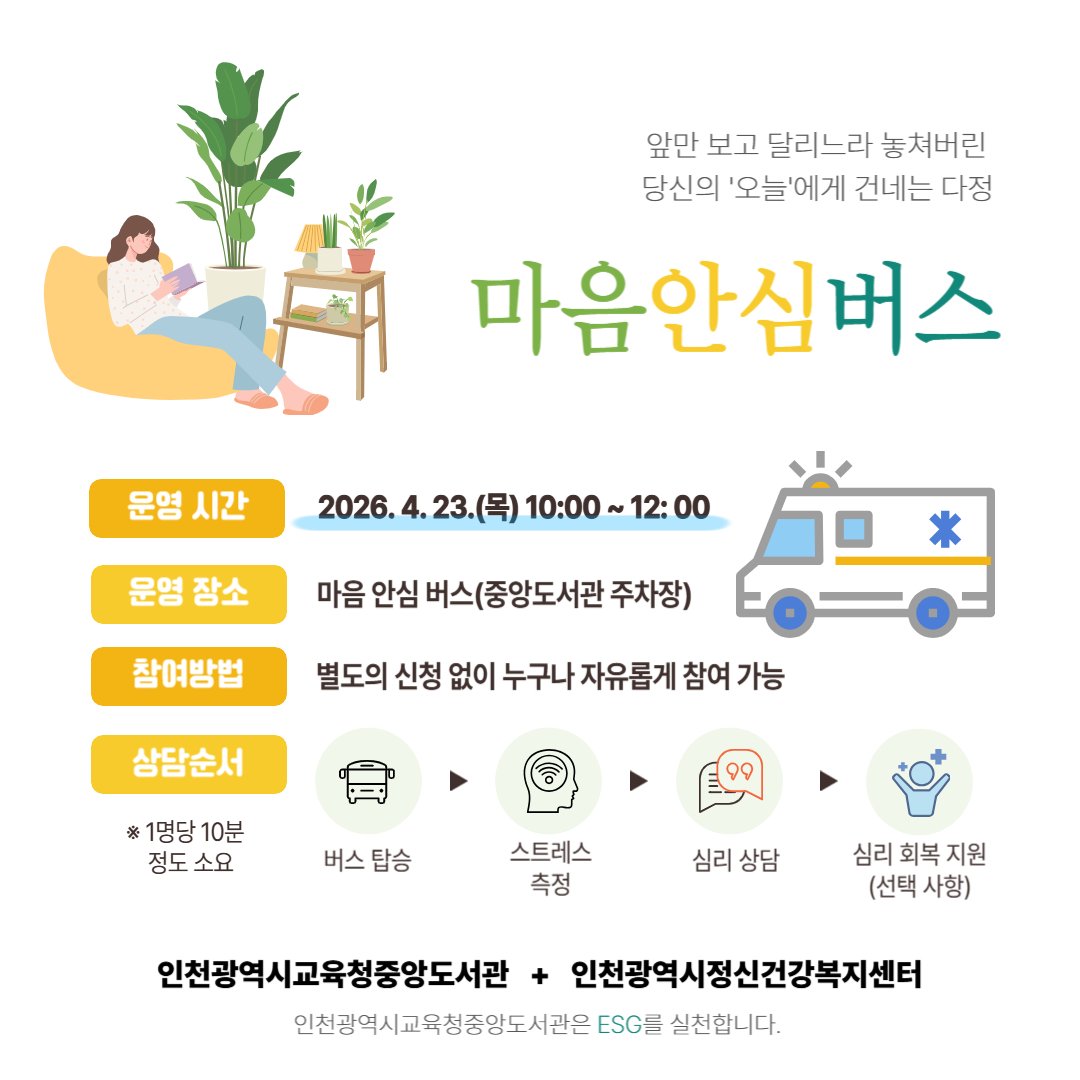 행사는 23일 오전 10시부터 12시까지 중앙도서관 주차장에 마련된 마음안심버스에서 진행되며 별도 사전 신청 없이 누구나 참여할 수 있다.