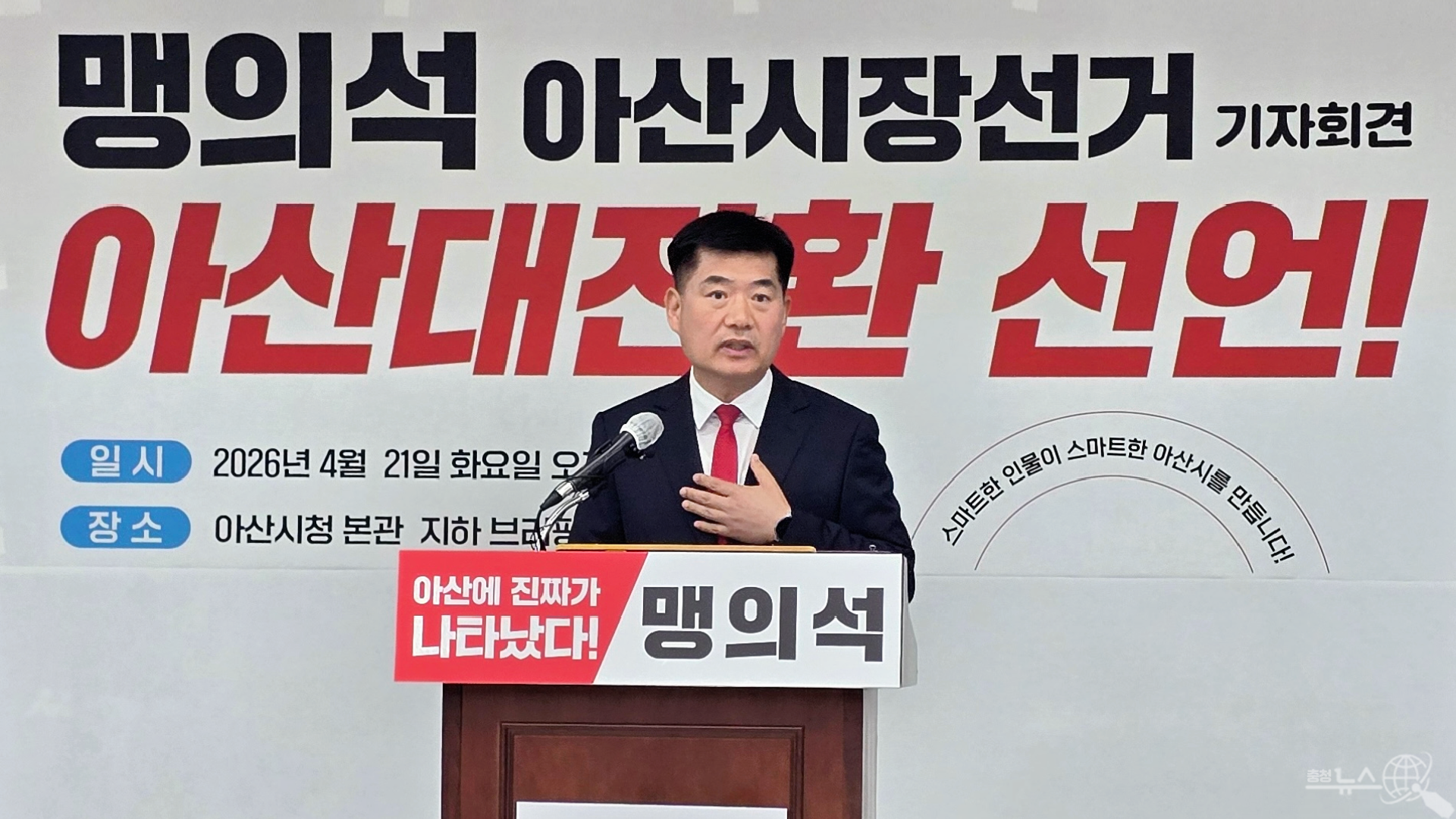 국민의힘 맹의석 아산시장 예비후보가 21일 아산시청 본관 지하1층 브리핑룸에서 공식 출마를 선언하며 "속도와 규모 중심의 성장을 넘어 시민 삶의 질을 바꾸는 대전환을 이루겠다" 고 밝혔다.