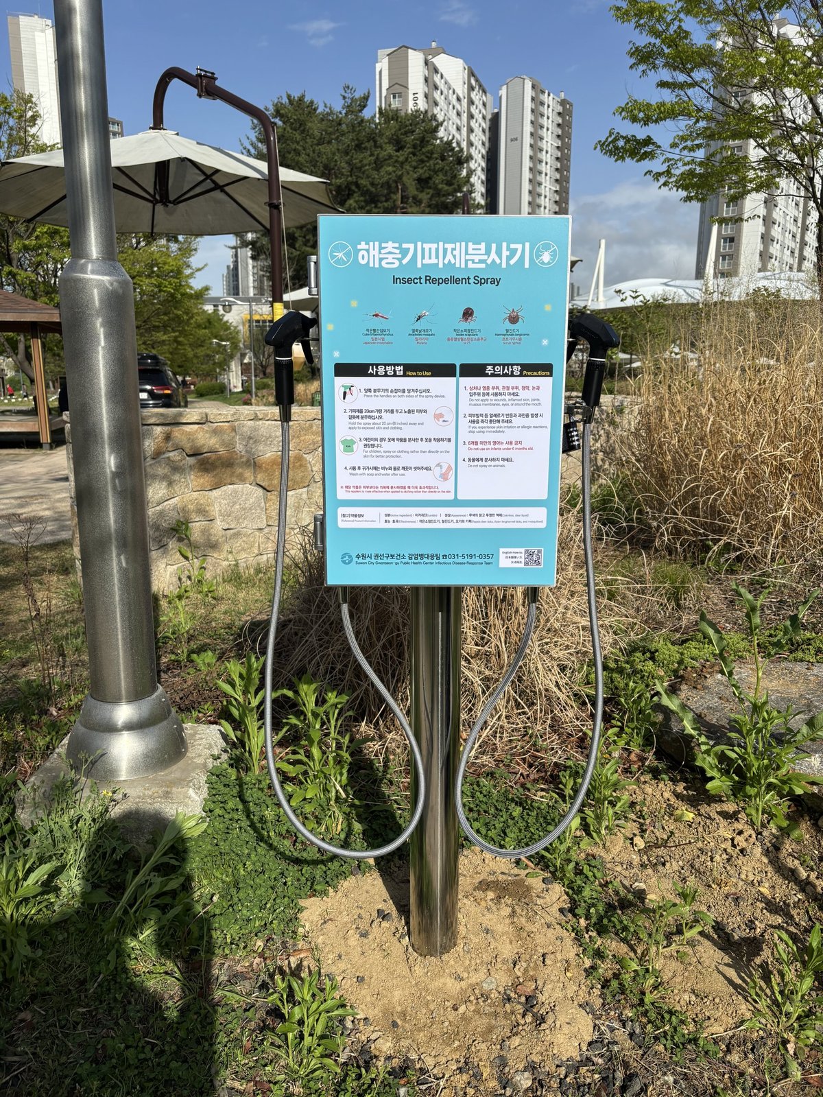[충청뉴스큐] 수원시 권선구보건소가 기온 상승과 야외 활동 증가 시기를 맞아 20일 관내 주요 공원과 산책로에 해충기피제 분사기를 확대 설치했다.