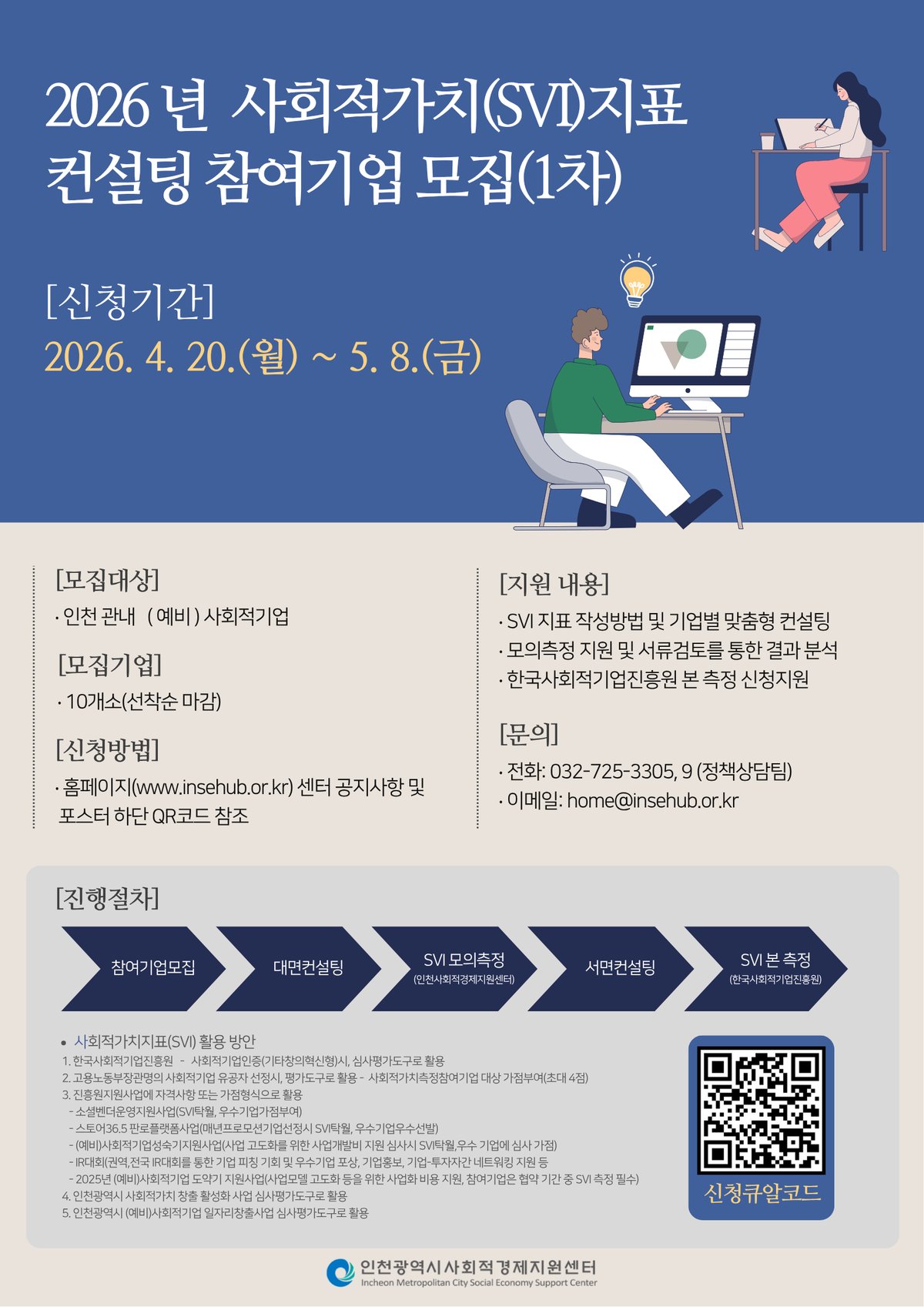 참고 2026년 사회적가치지표 모의측정 참여기업 모집 모집개요 사 업 명: 2026년 기업성과 통합측정지원 사업목적 - 사회적경제기업이 창출하는 사회적·경제적 가치를 종합 측정·평가해효과적인 경영 및 발전방향 제시 - 사회적경제기업이 자신이 창출하는 사회적가치를 객관적으로 측정해 투자시장 대응 역량 강화 모집대상: 인천 관내사회적기업 및 사회적기업 인증 준비 기업 모집기업: 10개소 진행절차 참여기업 모집 컨설턴트 배정 1차 대면컨설팅 온라인 접수 SVI측정 멘토 및 전문가 기업 당 1회 진행 사회적가치지표 측정 접수 2차 서면컨설팅 사회적가치지표 모의 측정 접수 한국사회적기업진흥원 사회적가치포털 내 접수 기업당 1회 진행 센터 내 사회적가치 자가측정 웹페이지 접수
