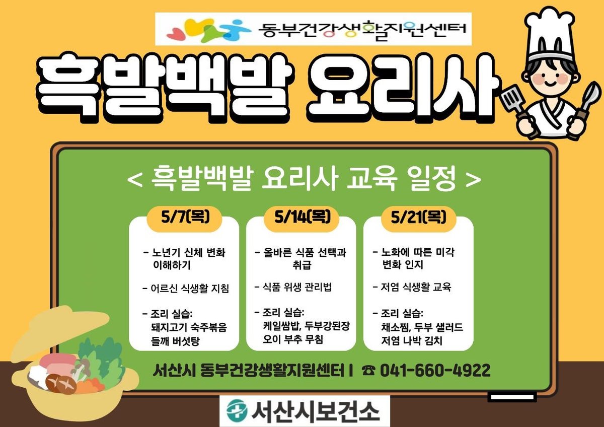 [충청뉴스큐] 서산시 보건소 동부건강생활지원센터에서 60세 이상 남성어르신을 대상으로 건강한 식생활 실천과 자가 건강관리 능력 향상을 위해 흑발백발 요리사 프로그램 대상자를 모집한다고 밝혔다.
