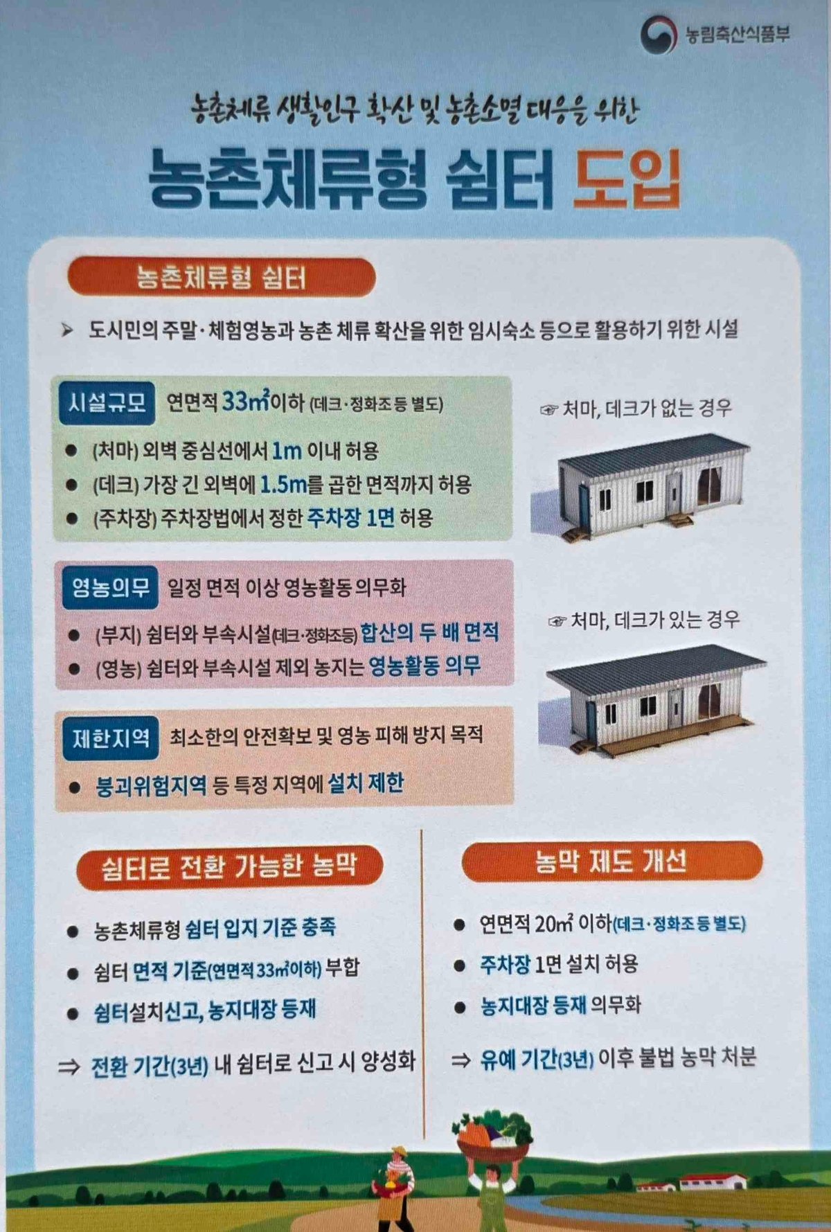 농촌체류형 쉼터는 농업인 또는 주말·체험영농을 하려는 사람이 영농을 목적으로 직접 활용하기 위해 농지에 설치하는 연면적 33㎡ 이하의 임시숙소다.