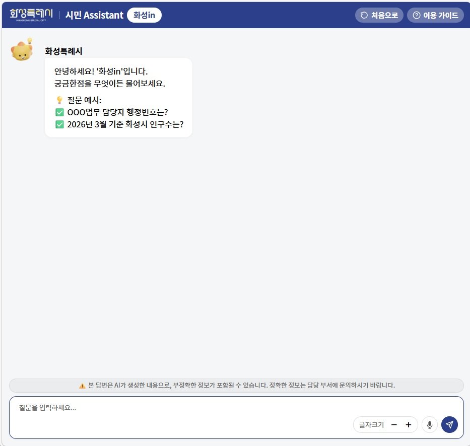 시는 기존 블로그, 조례, 주요 8개 민원 분야 정보를 중심으로 시범 운영해 오던 ‘화성in’에 생성형 AI 기능을 도입하고 정보 제공 범위를 확대해 서비스를 고도화했다.