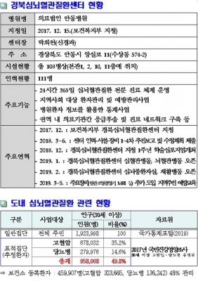 보건복지부는 2008년부터 전국 권역별로 14개 권역심뇌혈관질환센터를 지정해 왔는데, 경북도는 안동병원이 2017년 12월 15일 지정돼 그 동안 준비기간을 거쳐 이날 정식 개소했다.