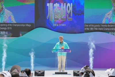 문화체육관광부와 광주세계수영선수권대회 조직위원회’ 는 5일 오전 11시 광주 광산구 우산동 광주세계수영선수권대회 선수촌 아파트 103동 앞에서 이용섭 조직위원장과 박용철 문화체육관광부 체육협력관, 대한수영연맹 김지용 회장, 최종삼 선수촌장 등이 참석한 가운데 개촌식을 가졌다.