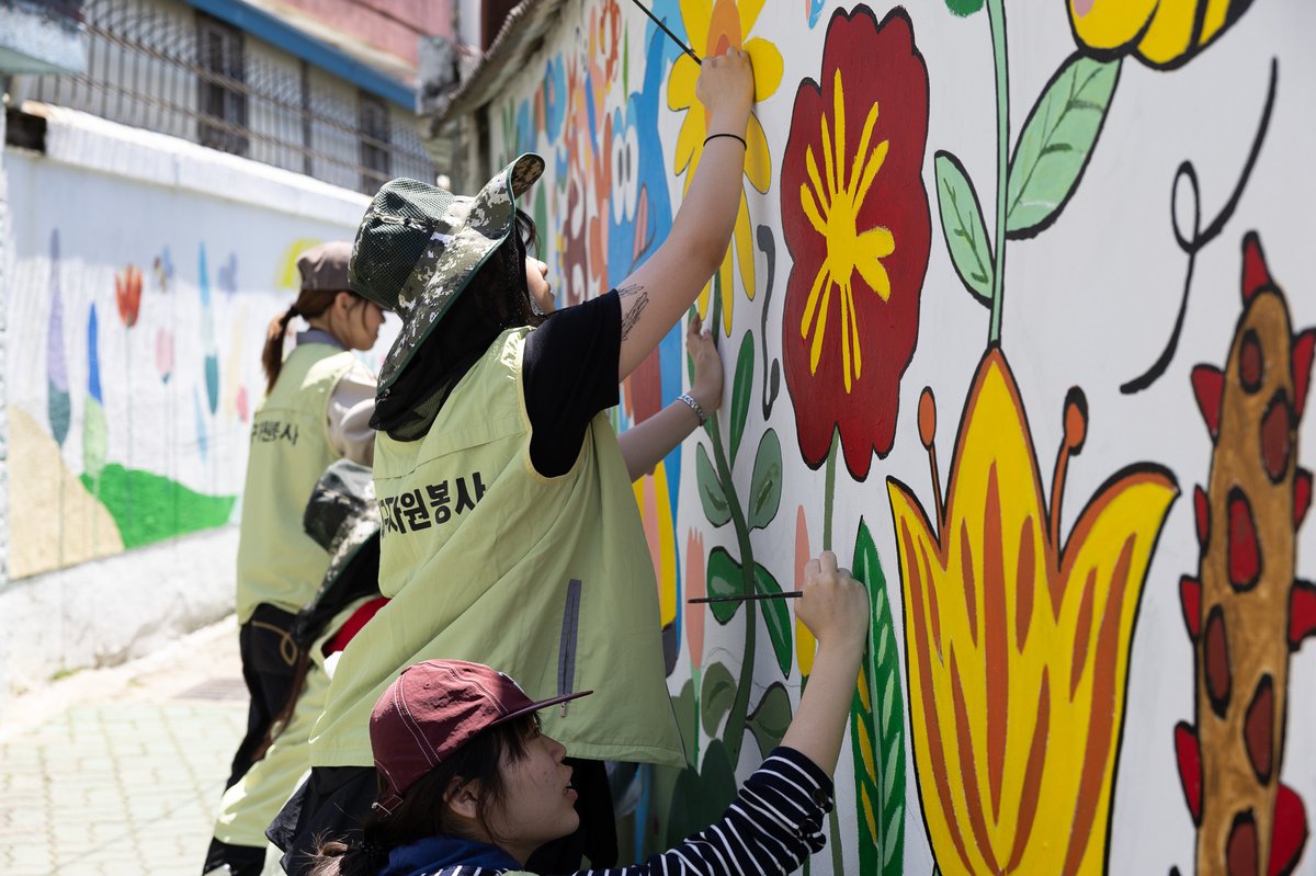 첫째 날에는 한국도로공사서비스, 대구기업자원봉사협의체 소속 대구교통공사, 제10기 V-파트너 대학생 자원봉사단 등 70여명이 참여했으며 둘째 날에는 대구중구가족센터, 초·중·고 학생, 계명대학교 봉사동아리 WITH 등 100여명이 합류해 벽화를 완성했다.