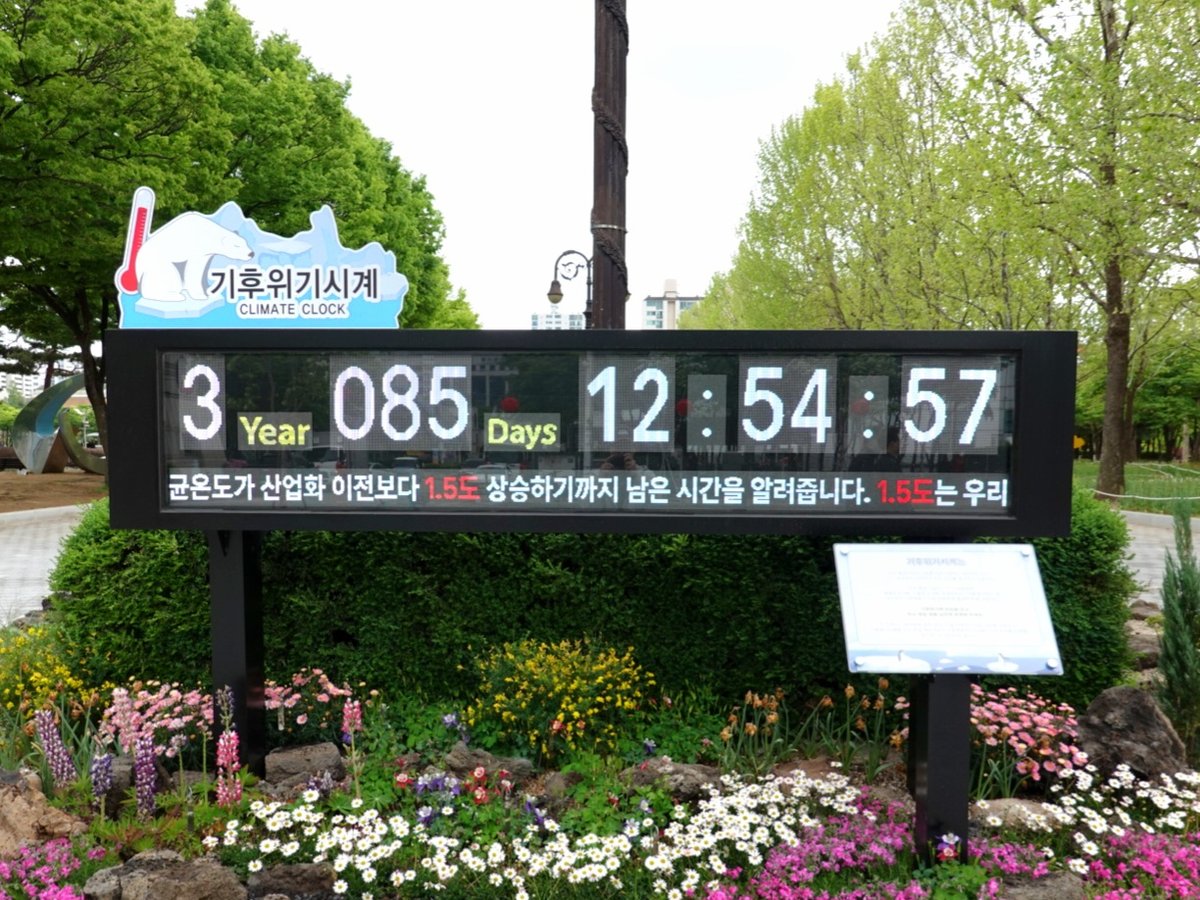 [충청뉴스큐] 지난 3일 안양시 평촌중앙공원에 ‘경기도 최초’로 기후위기시계가 설치되어 눈길을 끌고 있다.