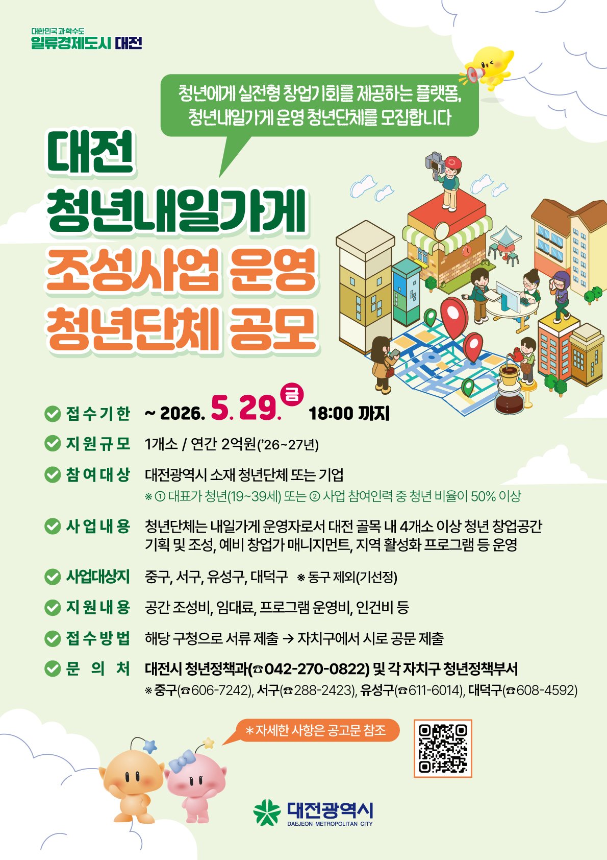 [충청뉴스큐] 대전시는 청년이 지역에서 창업을 직접 경험하고 성장할 수 있는 ‘청년내일가게 조성사업’ 운영 단체를 5월 29일까지 공개 모집한다.