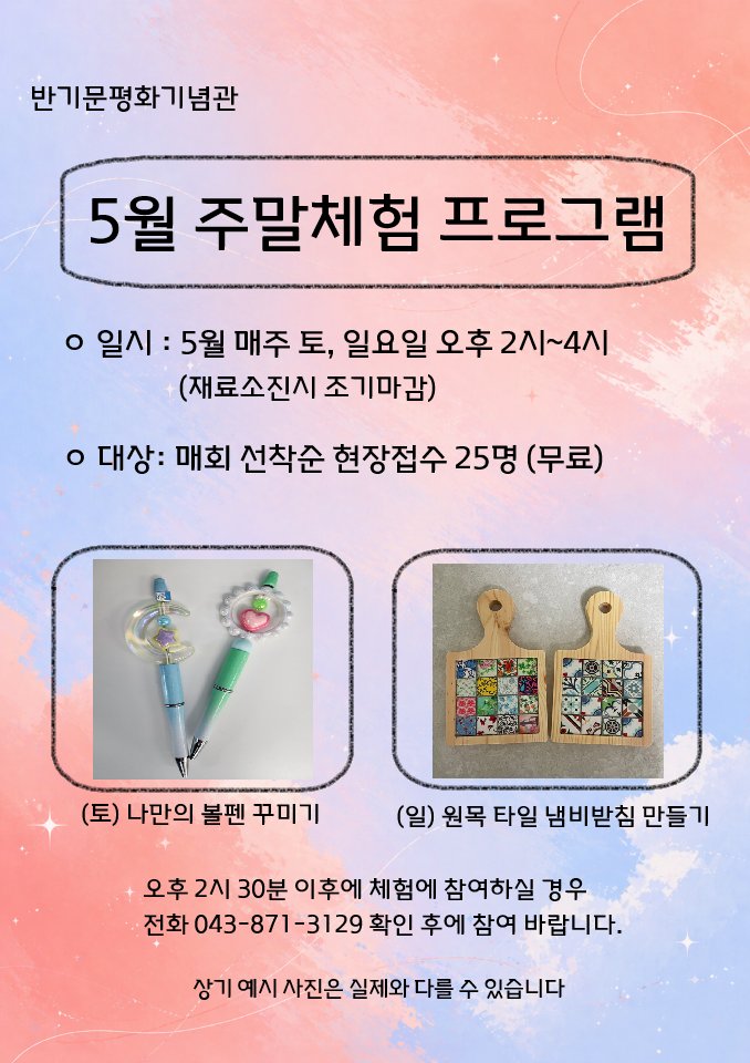 [충청뉴스큐] 음성군 반기문 평화기념관에서는 관람객을 위한 5월 주말 무료 체험 프로그램을 운영한다.