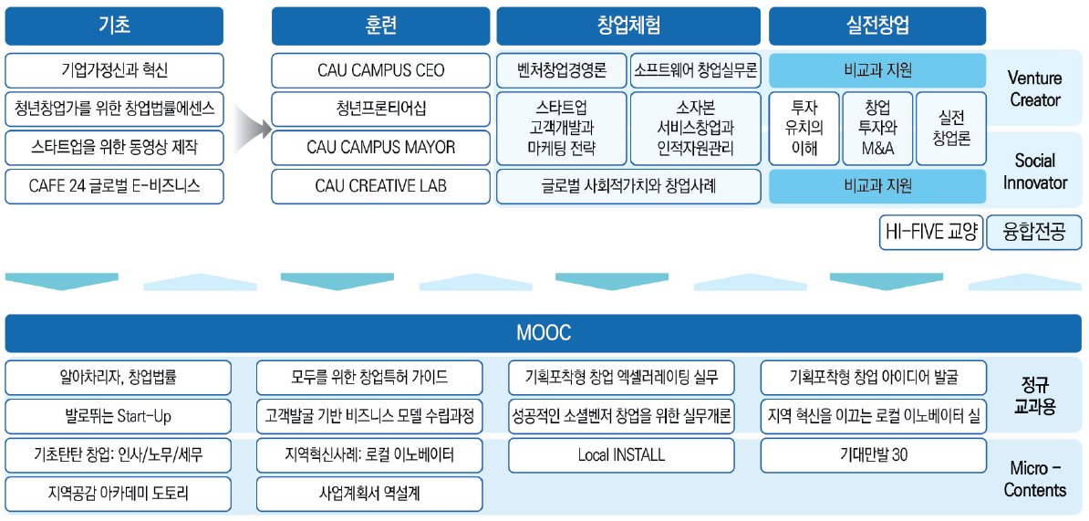 창업 친화적 학사제도 분야에는 창업연계전공을 도입하고 연계 대학 간 창업학점교류를 할 수 있게한 중앙대학교와, 창업대체논문제도를 포함해 창업과 학업 병행에 따른 어려움을 최소화한 학사제도를 제공하는 인하대학교의 사례가 포함됐다. 아울러 창업교육 전담조직을 통합 구성하고 창업교육 전문인력을 위한 교육과정을 운영하고 있는 건국대학교 사례도 함께 소개했다.