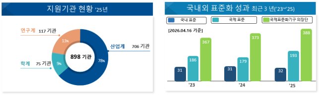 과기정통부는 국제표준 선도를 통한 우리 기업의 표준화 역량 및 국가경쟁력 제고를 위해 시장에서 필요로 하는 표준을 ➊국내 산학연이 적시에 개발·검증하고 ➋표준화 포럼 등을 통해 개발된 표준의 확산을 꾸준히 지원하고 있다’ 25년한 해에만 산업계 706개, 학계 75개, 연구계 117개 등 총 898개의 기업·기관을 지원해’ 25년한 해에만 193건의 국제표준, 32건의 국내표준이 제정됐다.